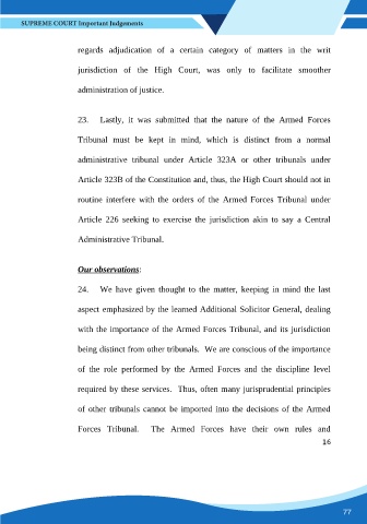 jurisdiction under Article 226 of the Constitution in the following cases: 23. Lastly, it was submitted that the nature of the Armed Forces